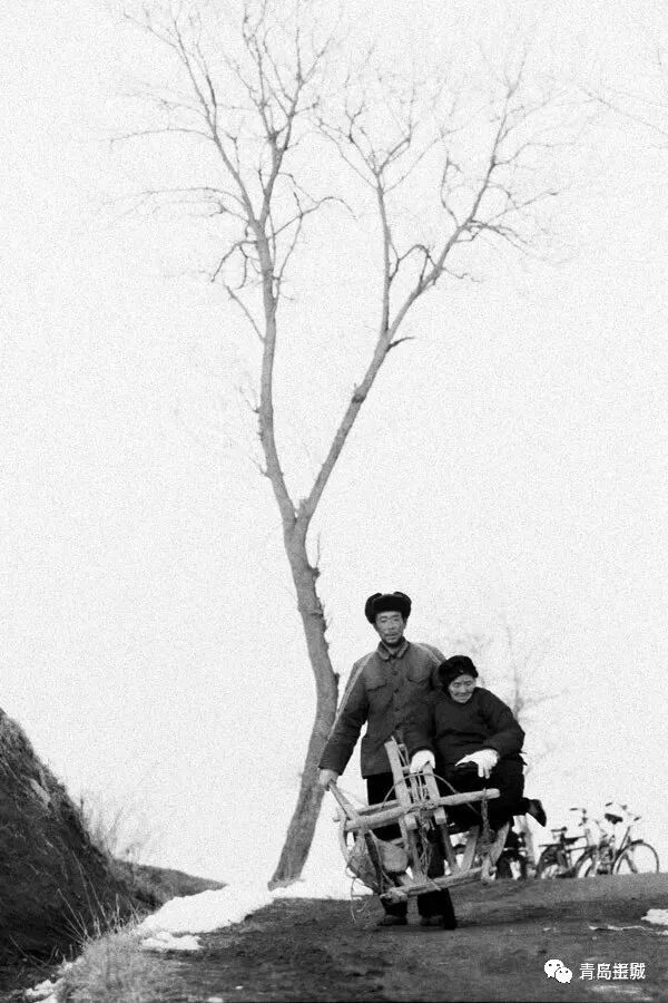 △1983年正月里,铁山杨家山里的乡间小路上,儿子用小推车载着老母亲去串亲戚。(王群 摄)