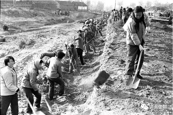 △1986年入冬,胶南铁山苗家全村劳动力齐上阵,修水浇地配套设施。(王群 摄)