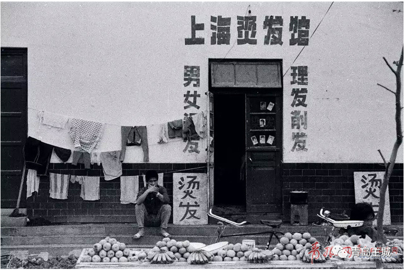 △1982年,小商贩在河北路一家上海烫发馆门前摆摊卖水果。(王群 摄)
