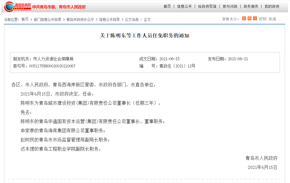 各区、市人民政府,青岛西海岸新区管委,市政府各部门,市直各单位: 2021年6月15日,市政府决定,任命: 陈明东为青岛城市建设投资(集团)有限责任公司董事长(任期三年)。 免去: 陈明东的青岛华通国有资本运营(集团)有限责任公司董事长、董事职务; 申家泰的青岛海湾集团有限公司董事职务; 赵树民的青岛市市场监督管理局副局长职务; 迟本理的青岛工程职业学院副院长职务。 青岛市人民政府 2021年6月15日 责任编辑:管佳宇 0