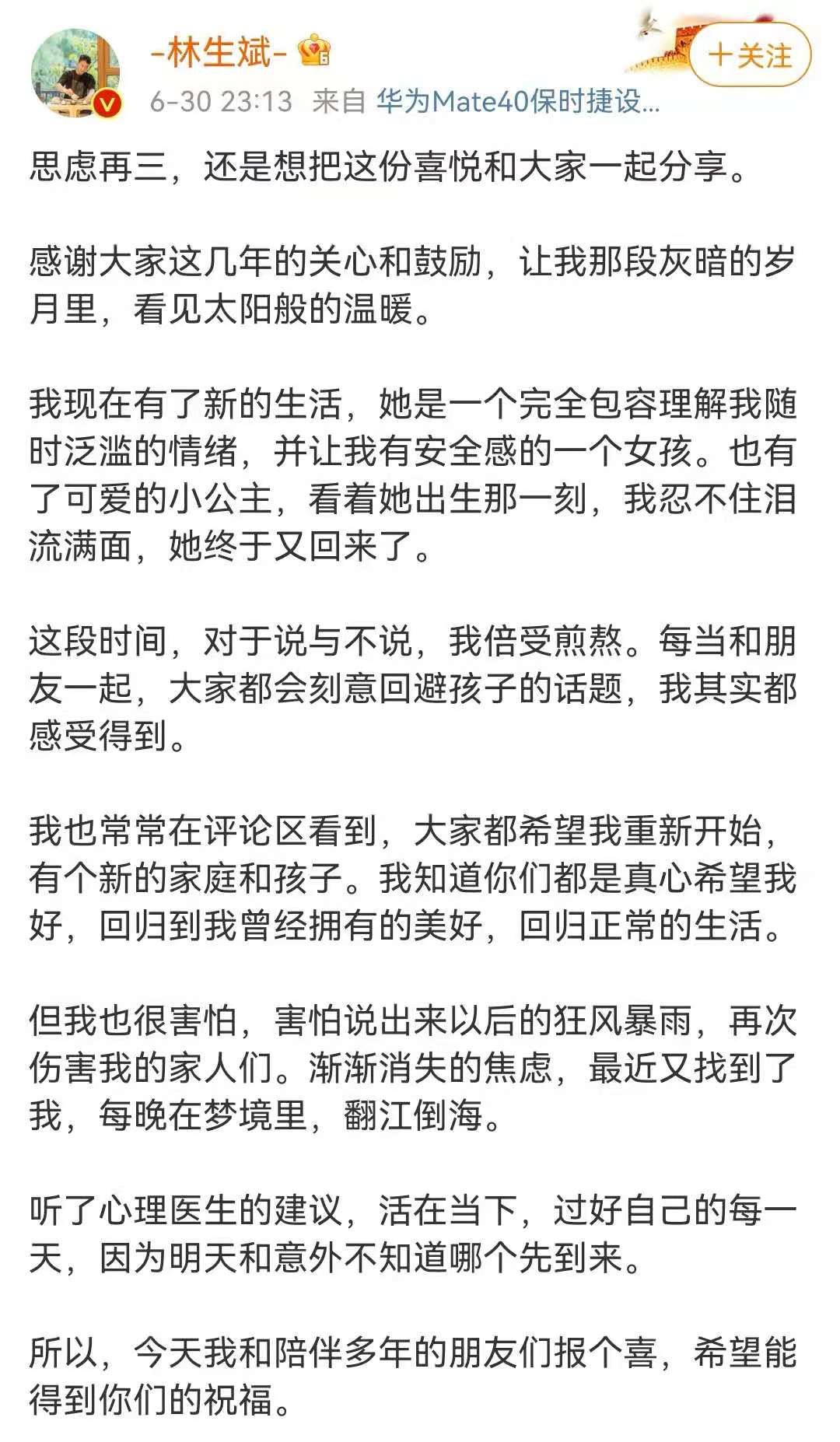 6月30日晚上11点,林生斌宣布,自己有个女儿。