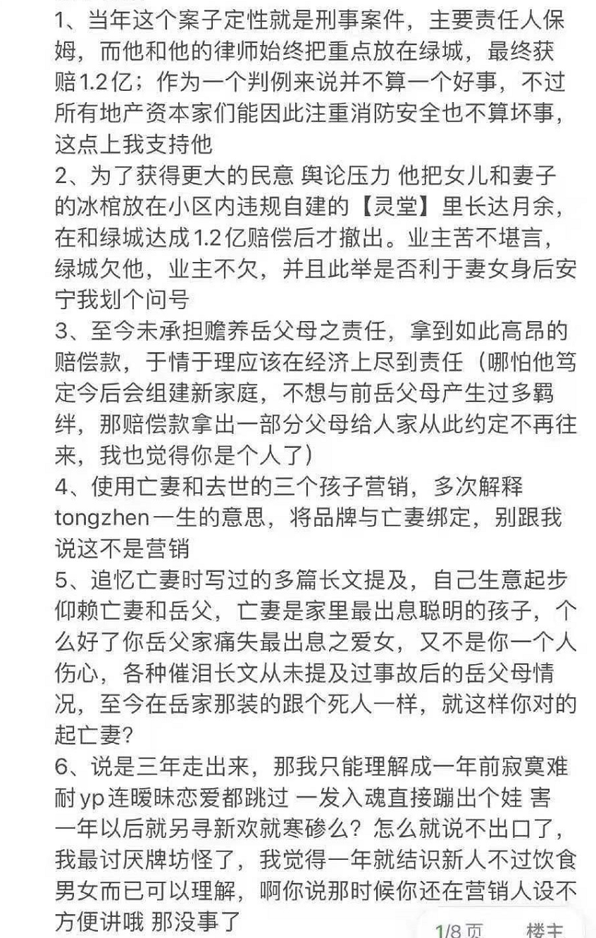 “拿着四条生命的赔偿款,摆着深情款款的人设消费大众,在短时间内完成恋爱结婚生女的过程。”