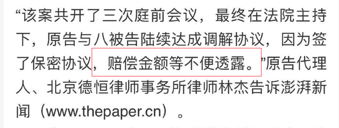 还有大家最关注的赔偿问题,当时新闻报道,他索赔1.3亿元,官司打了两年,一直到19年4月份达成了和解。