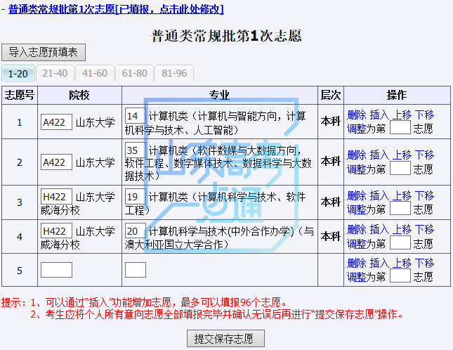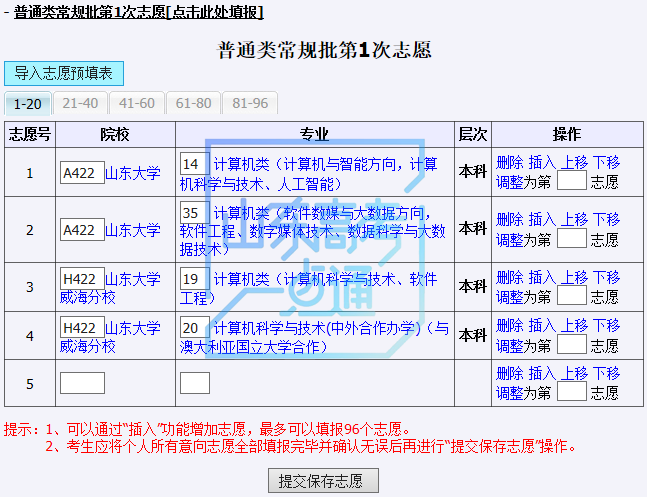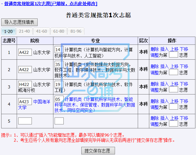 这里,考生还可对志愿进行增加、修改、插入、删除、上移、下移、调整顺序等操作。在调整顺序时,考生可输入“调整为第_志愿”直接调整志愿顺序,例如:输入1,按回车键或点击调整,志愿将调整到第1志愿。