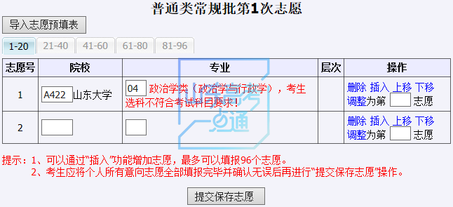 当考生输入的院校、专业不存在,或者不符合专业选科要求时,系统红色字体提示,也无法保存和提交,如下图: