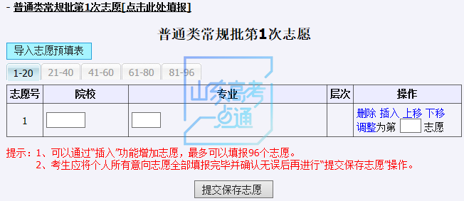 这里可手工输入志愿信息,如在志愿辅助系统保存过志愿预填表,可点击“导入志愿预填表”,系统提醒考生确认,如下图: