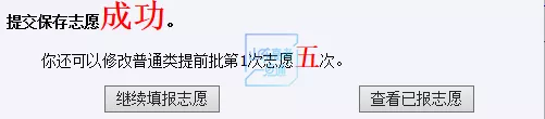 答:以普通类提前批志愿填报为例,输入个人登录密码后点击“确定”,系统提示保存志愿操作成功,如下图: