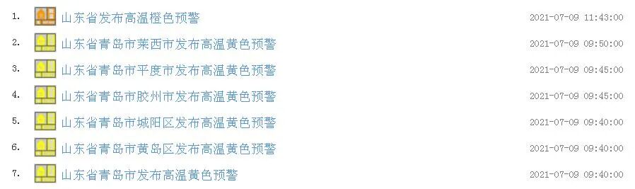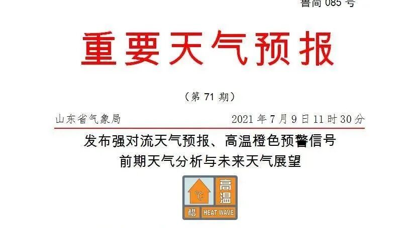 根据国家预警信息发布中心消息,预计未来三天,我省内陆大部地区将出现35℃以上的高温天气。其中:9日,德州、聊城、菏泽、济宁37~39℃;10~11日,德州、聊城、济南、滨州、东营、淄博、潍坊、菏泽、济宁37~39℃。为此,山东省气象台于7月9日11时00分发布高温橙色预警信号。