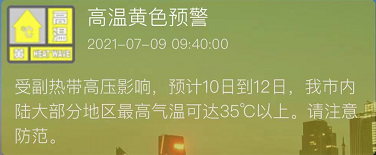 受副热带高压影响,预计10日到12日,我市内陆大部分地区最高气温可达35℃以上。请注意防范。