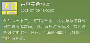 预计今天下午,我市南部地区及近海海域有分散性阵雨或雷雨,局地有短时强降水,雷雨时阵风8到10级,胶州、西海岸和崂山部分地区可能有冰雹。