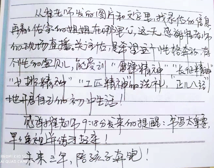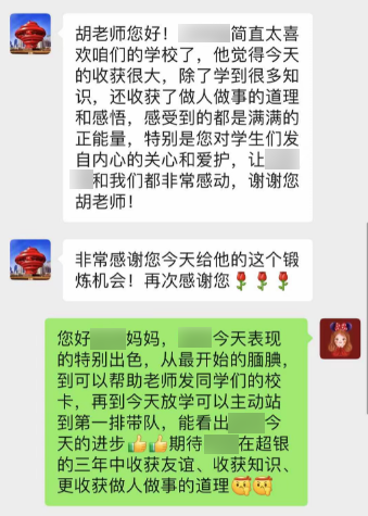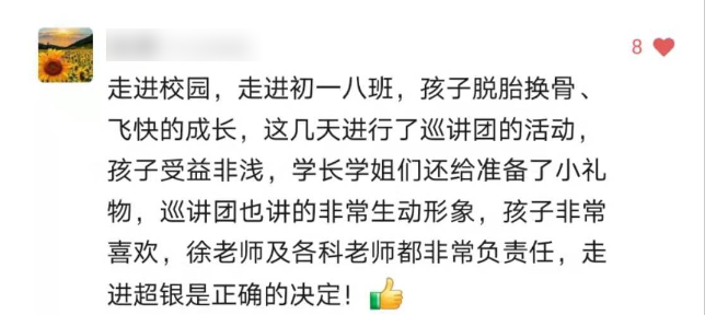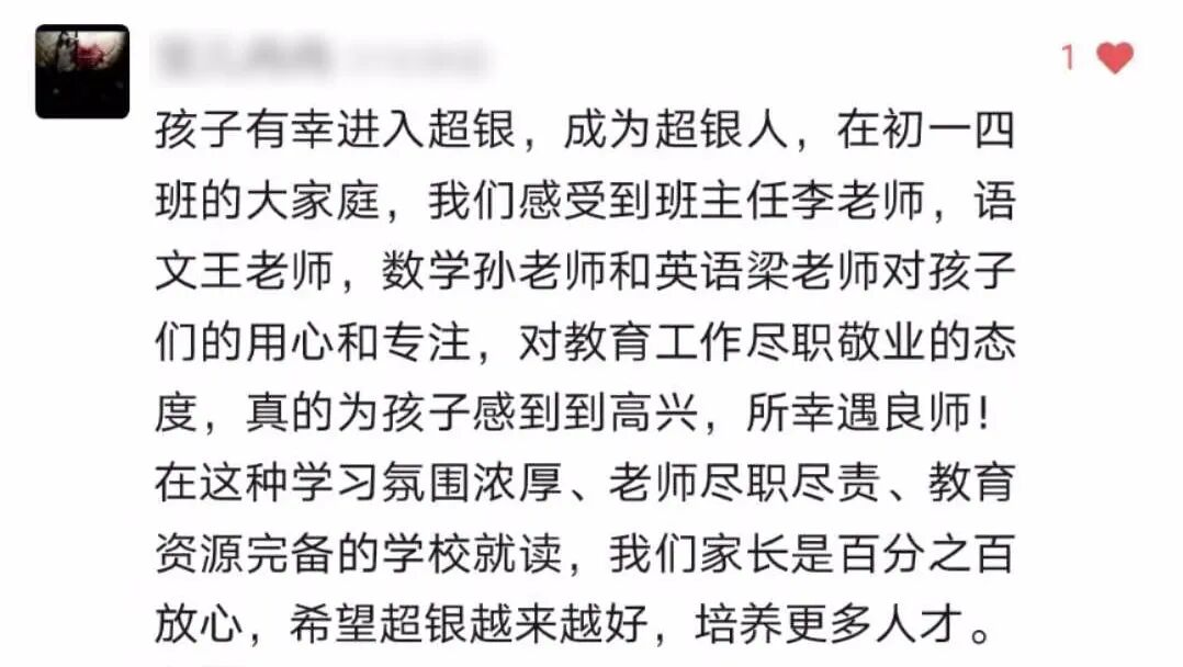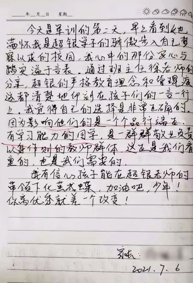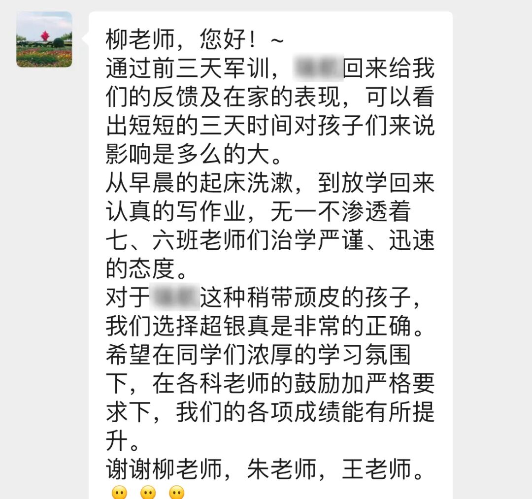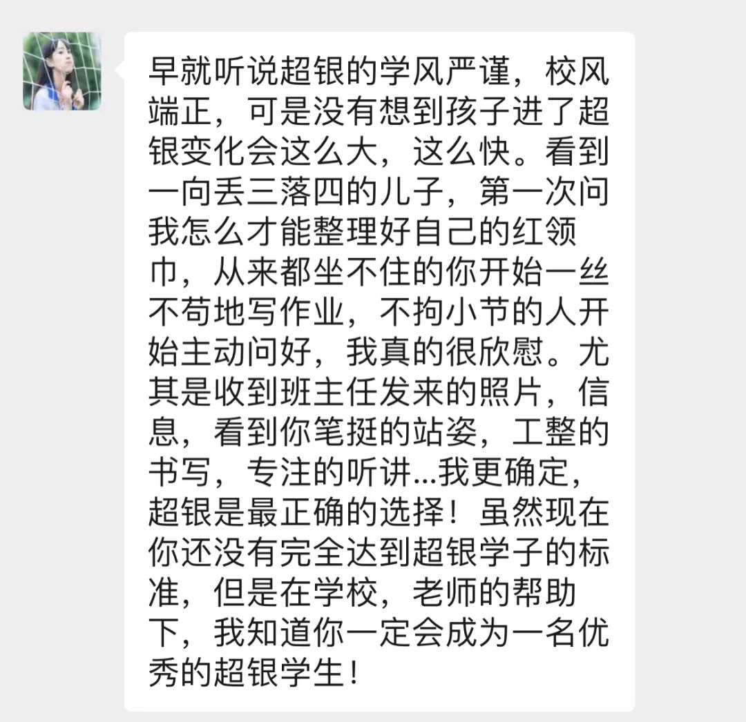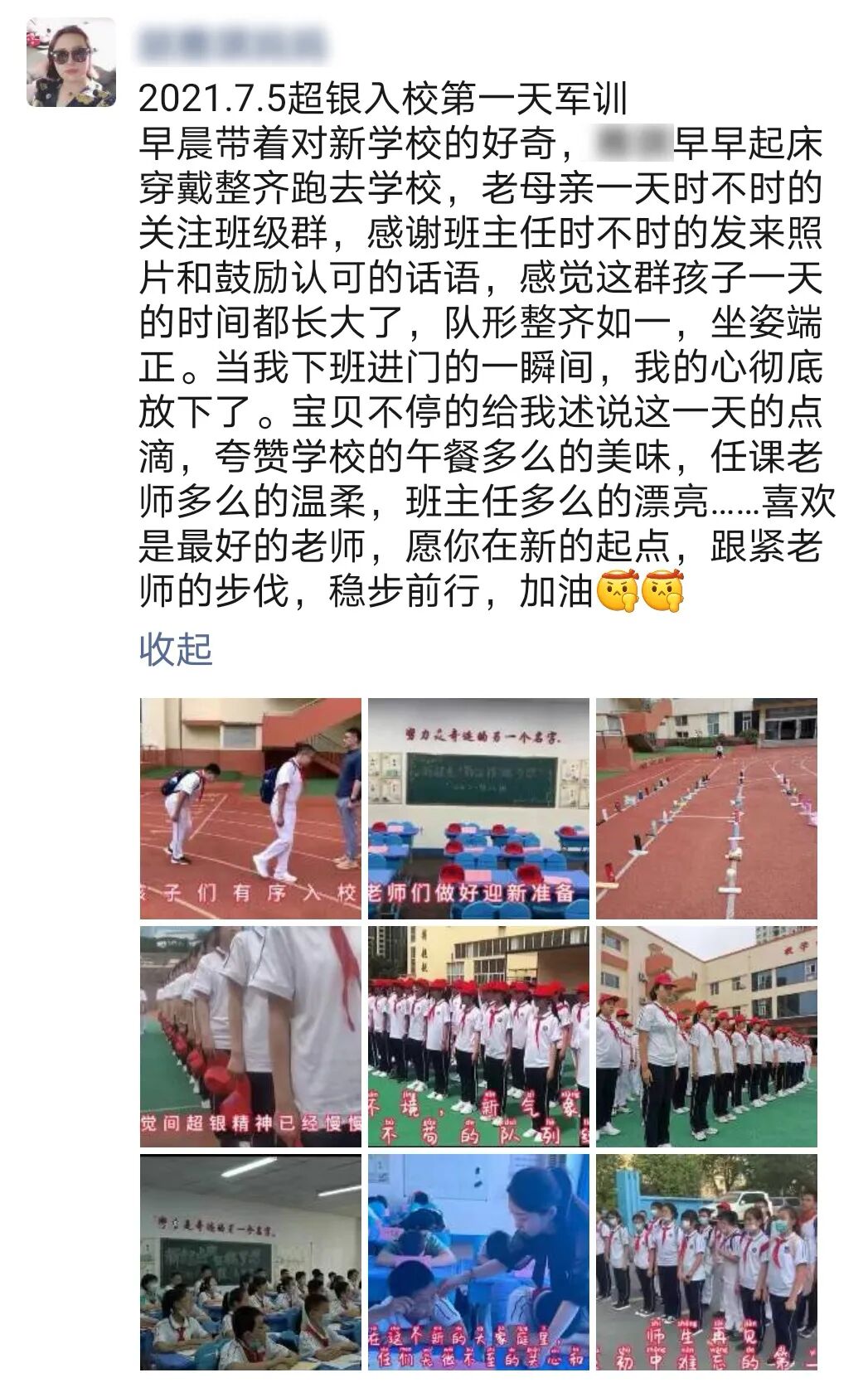 七月伊始,超银中学以传统惯例——新生入学教育开启了2021级新生的“入学第一课”。五天的时间里,学生们与老师深入接触,接受严格的军事训练,系统学习学校规章和文化。 五天时间,考验的是学生,牵挂的是家长。新的学校孩子是否喜欢?新的学习环境孩子是否能适应?炎热的天气孩子身体是否能吃得消?……从担心到安心,超银老师用细致入微的关注、贴心的“实时播报”为家长打消顾虑;短短几天,孩子身上“肉眼可见”的蜕变更是家长彻底放心。五天时间,我们交上了一份令家长满意的“成绩单”。 家长们按捺不住内心的喜悦,与我们分享孩子的变化。