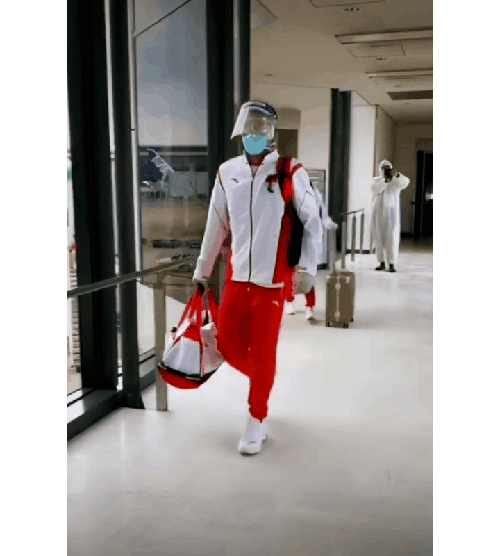 中国队成员穿着国家队队服、戴着口罩和面罩,推着行李走出机场,之后乘坐组委会提供的大巴前往下榻酒店。